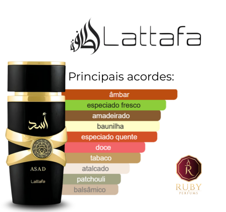 Asad de Lattafa Perfumes é um perfume Âmbar Masculino. Asad foi lançada em 2021. As notas de topo são: Pimenta Preta, Tabaco e Abacaxi. As notas de coração são: Patchouli, Café e Íris. As notas de fundo são: Baunilha, Âmbar, Madeira Seca, Benjoim e Ládano.