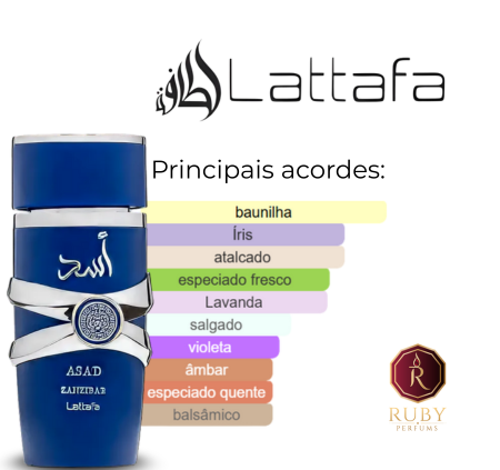Asad Zanzibar de Lattafa Perfumes é um perfume Masculino. Esta é uma nova fragrância. Asad Zanzibar foi lançada em 2024. O perfumista que assina esta fragrância é Fanny Bal. As notas de topo são: Lavanda e Pimenta Preta. As notas de coração são: Água de Coco, Íris e Sal. As notas de fundo são: Baunilha e Incenso.